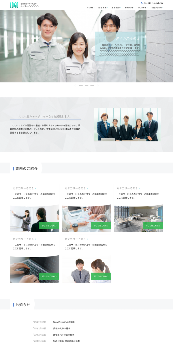 本サイトは企業様や団体様向けのサイト見本です。デモサイト①は白を基調としたスッキリしたデザイン、デモサイト②は画像を多用したビジュアル重視のデザインとなっております。又、お客様ご自身でサイトの掲載内容を更新できる様にワードプレスというソフトを組み込んだサイトのデモンストレーションとなっており、実際にワードプレスを操作して新着情報を投稿する操作を体験していただけます。